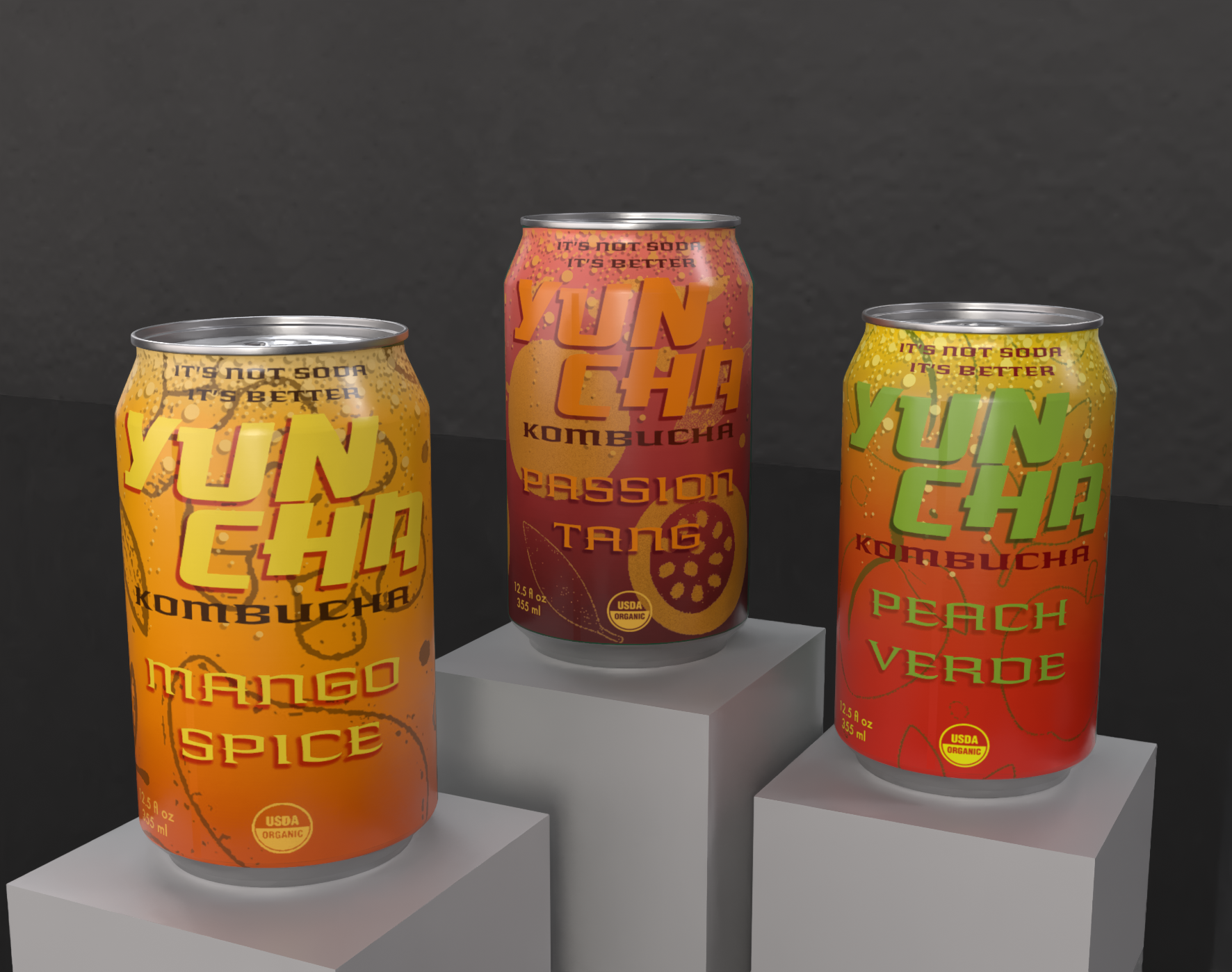 This packaging project for Yun Cha shows off three fun and fruity kombucha flavors. Each can uses colors and shapes that match the taste inside. The designs are simple, fresh, and made to catch the eye.